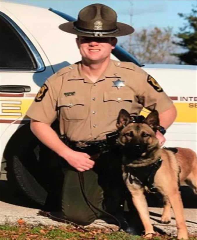On June 28, 2017, Trooper Ryan Albin #5718 was killed in a vehicle crash on I-74, near milepost 155, in the area of Farmer City at approximately 3:10 pm. His patrol car collided with a box truck as the vehicles reduced speed for slow moving traffic in a construction zone. He was flown to a local hospital where he succumbed to his injuries. Trooper Albin’s partner, Canine Biko was transported to a veterinary hospital with minor injuries. Trooper Albin had served with the Illinois State Police for 11-1/2 years and was assigned as a canine handler in District 6. Trooper Ryan Albin was loved by his peers. Ryan was a big man with an infectious laugh.